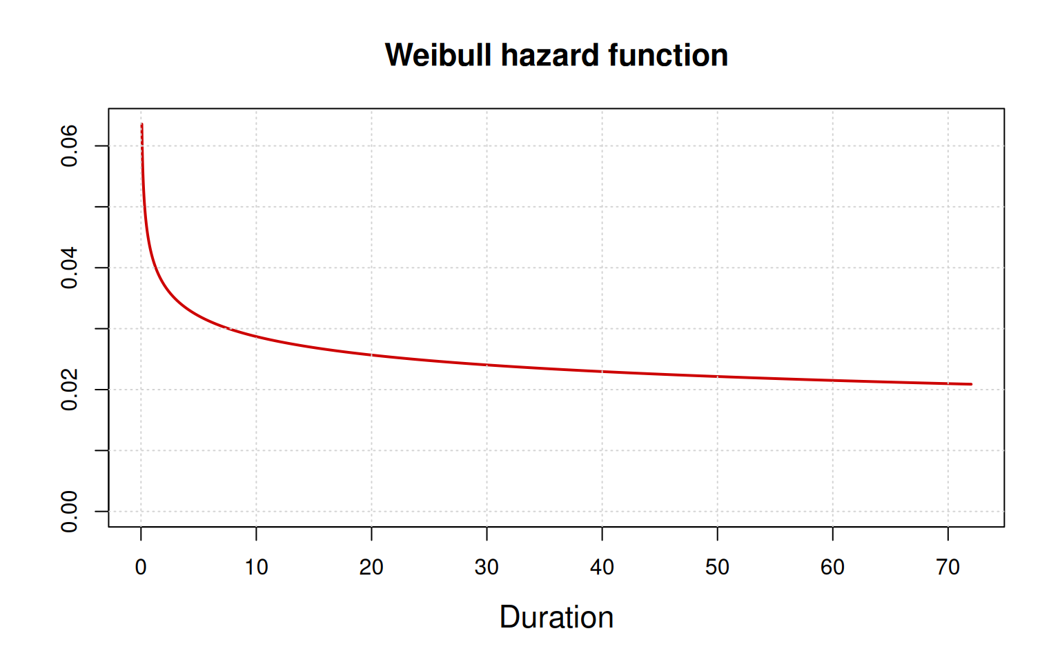 The hazard curve (or function) is decreasing. The hazard of churn is highest in the first 7 to 10 months (duration). After this initial period, the hazard rapidly declines and then flattens out.