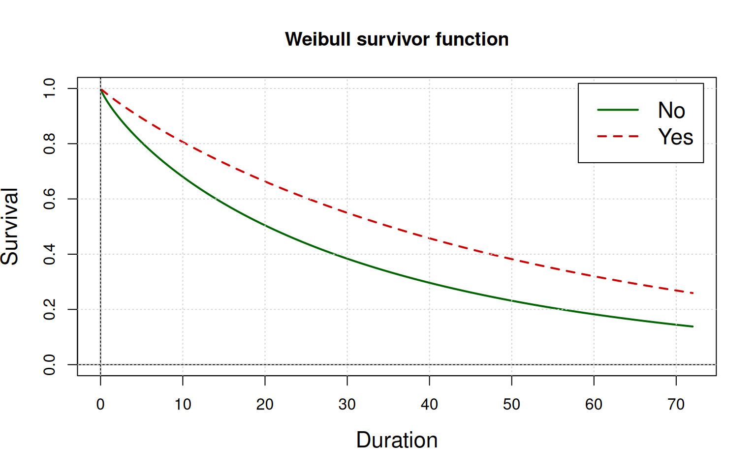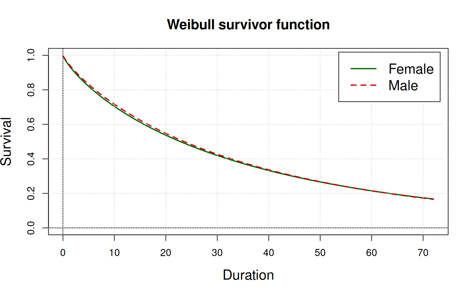 We begin with a Weibull Proportional Hazards (PH) model, using two independant variables or covariates: