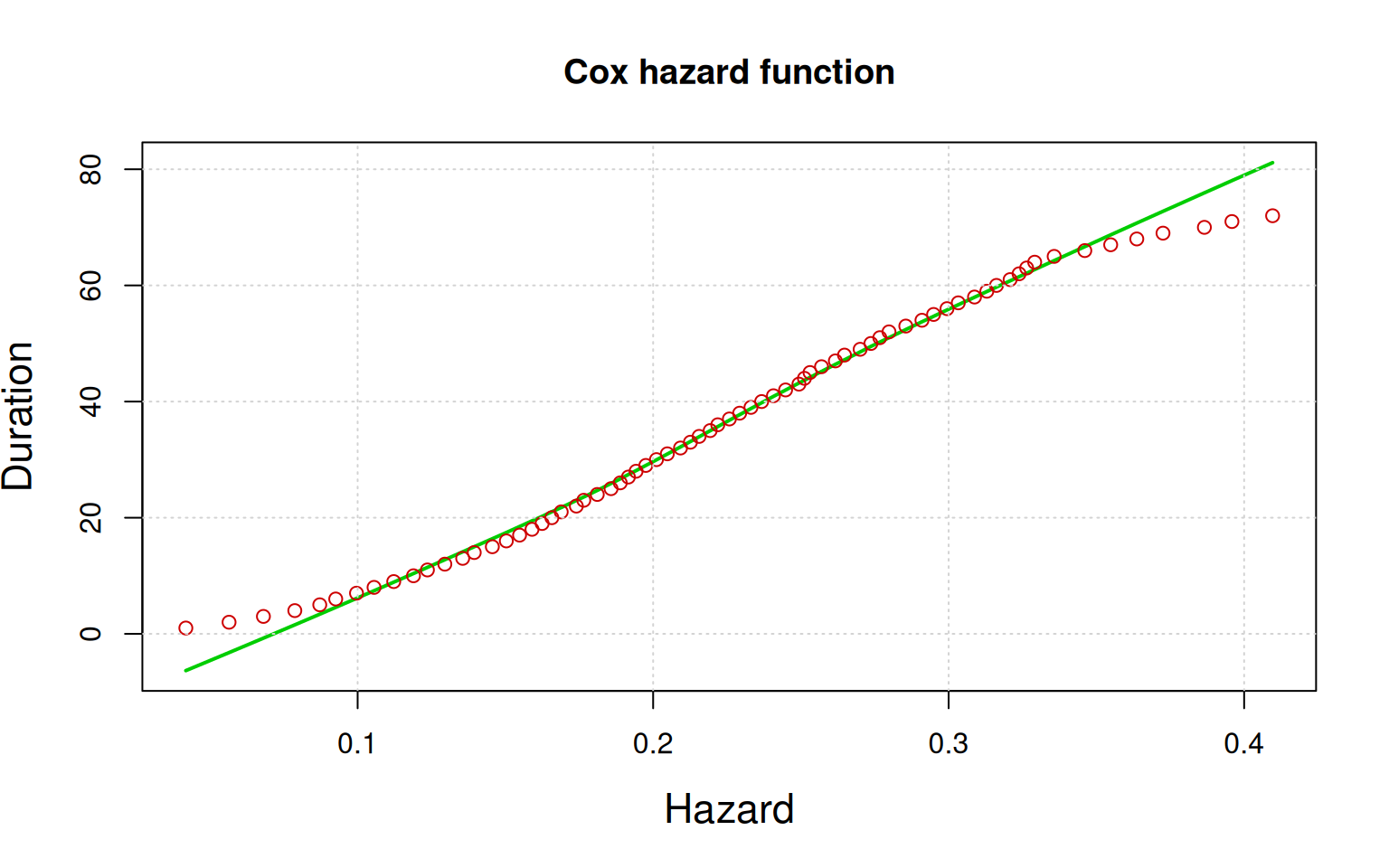 The red dots are the observed. The green line is the predicted survival curve. The graphic is similar to a Q-Q plot to estimate normality (compare a covariate distribution in red against the Gaussian or Normal distribution in green). The discrepancy, particularly at the extremes, is a normal part of modeling real-world data. It indicates that the model’s fit is not perfect, which is to be expected.